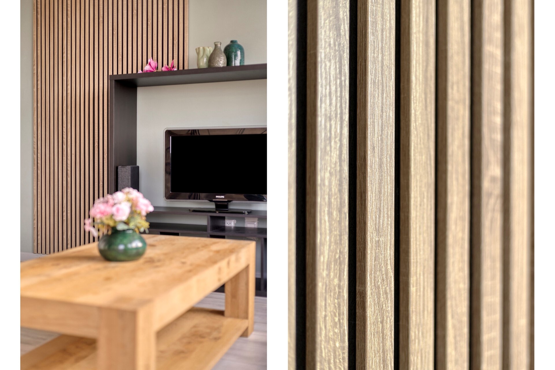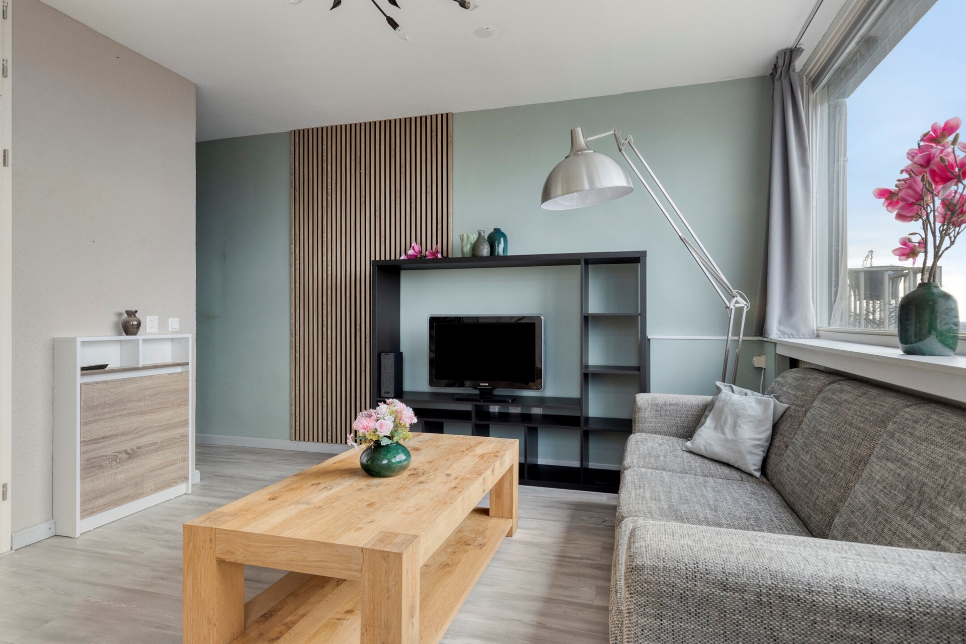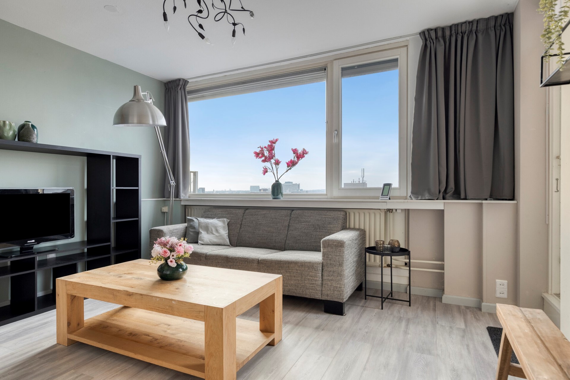 • Woonkamer: strak afgewerkt, veel licht, prachtig uitzicht, elektrisch rolluik, extra inbouwkast