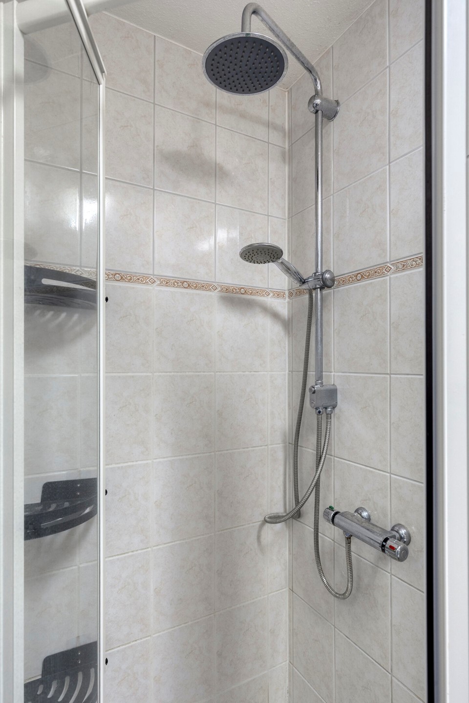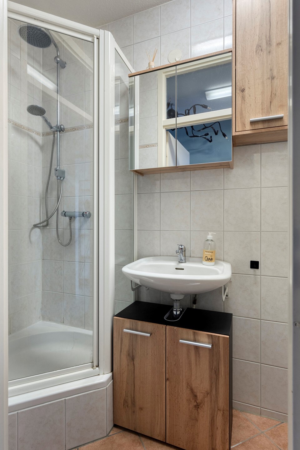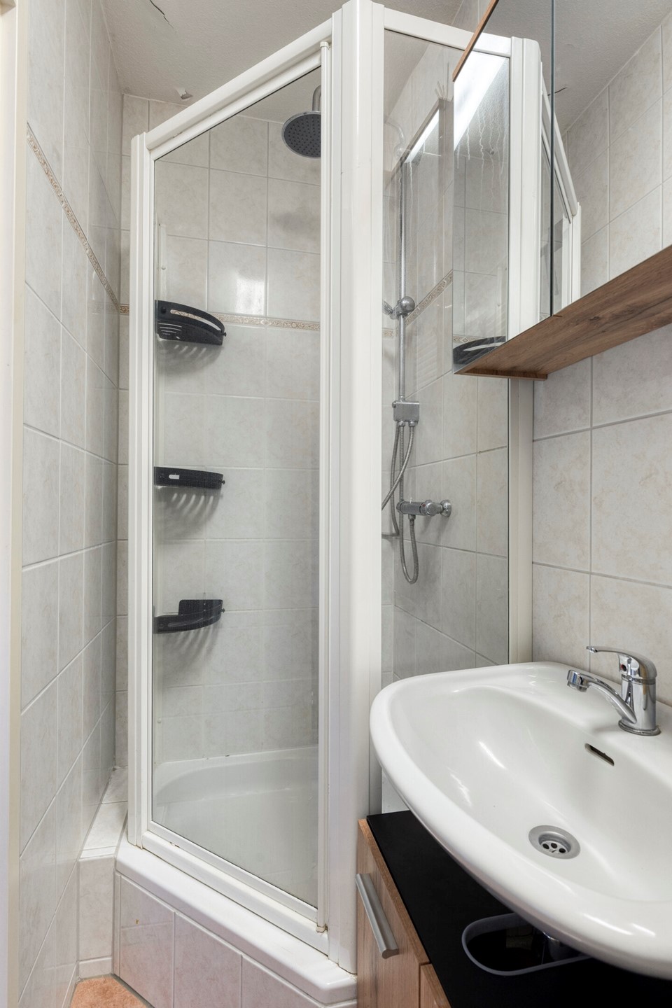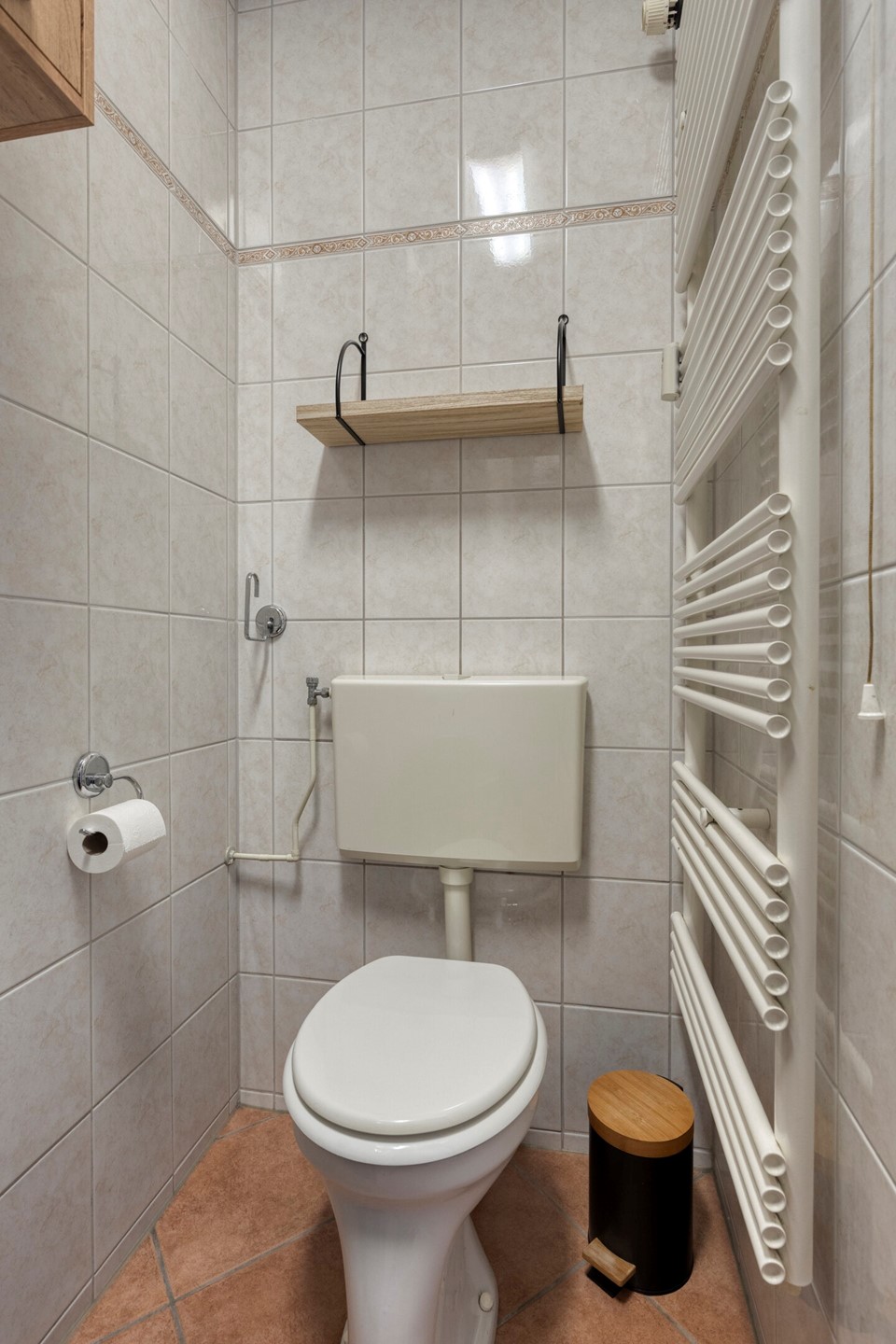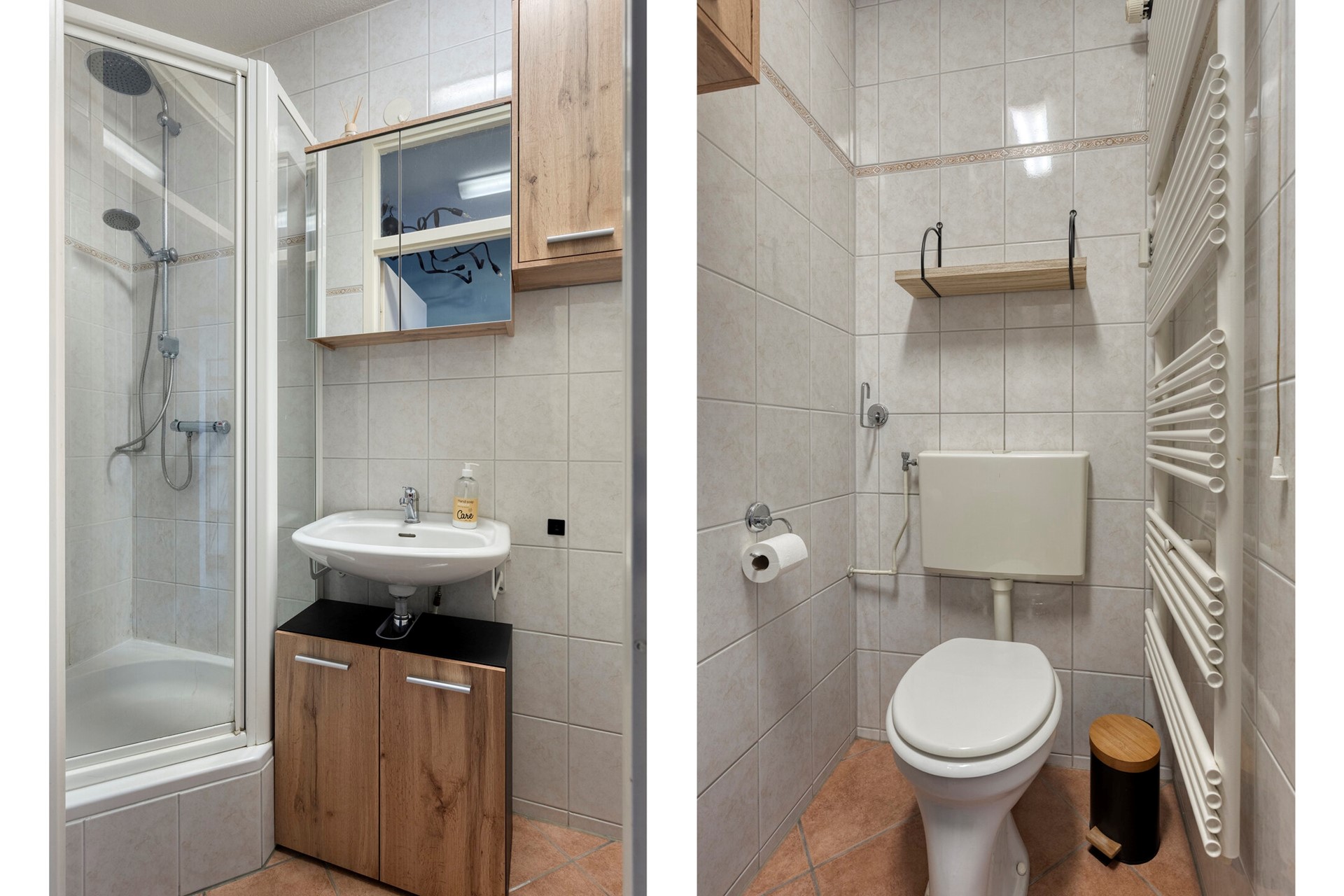 • Badkamer: volledig betegeld, met douche, toilet, wastafelmeubel en designradiator
