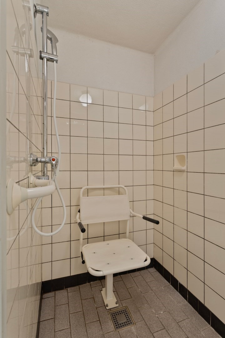 Entree met meterkast, trapopgang en toegang tot de woonkamer ensuite serre en keuken met eenvoudige keukeninrichting. Vanuit de keuken bereikt met via een portaal de berging met toegang tot een toilet en een doucheruimte.